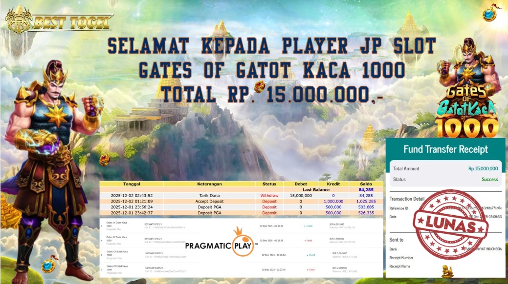Selamat kepada User id : AGW****** Telah berhasil mendapatkan kemenangan besar pada permainan SLOT GATES OF GATOT KACA 1000 dengan total kemenangan Sebesar Rp.15.000.000,- Setelah mengisi formulir withdraw dengan kurung waktu hanya 5 – 10 menit pihak  BESTTOGEL sudah melakukan transfer kepada pemilik Userid dan dana sudah dapat di cairkan oleh pemenang. Bukti pembayaran yang kami berikan merupakan bukti pembayaran yang SAH / VALID yang langung di dapatkan melaui tanda transfer transaksi dari Bank yang di tuju.
