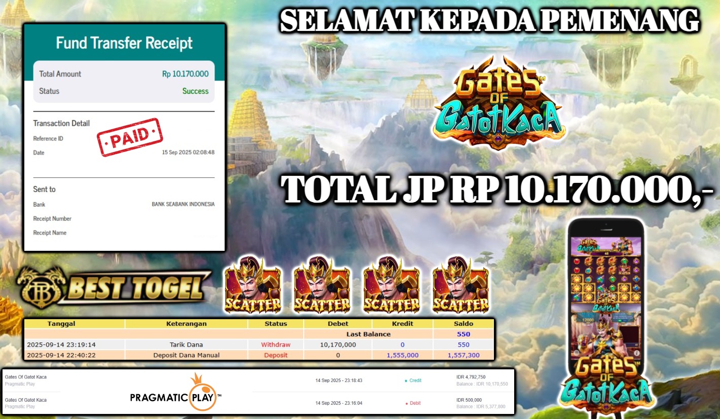 kepada User id : fir***** Telah berhasil mendapatkan kemenangan besar pada permainan SLOT GATES OF GATOT KACA dengan total kemenangan Sebesar Rp. 10.170.000,- Setelah mengisi formulir withdraw dengan kurung waktu hanya 5 – 10 menit pihak BESTTOGEL sudah melakukan transfer kepada pemilik Userid dan dana sudah dapat di cairkan oleh pemenang. Bukti pembayaran yang kami berikan merupakan bukti pembayaran yang SAH / VALID yang langung di dapatkan melaui tanda transfer transaksi dari Bank yang di tuju.