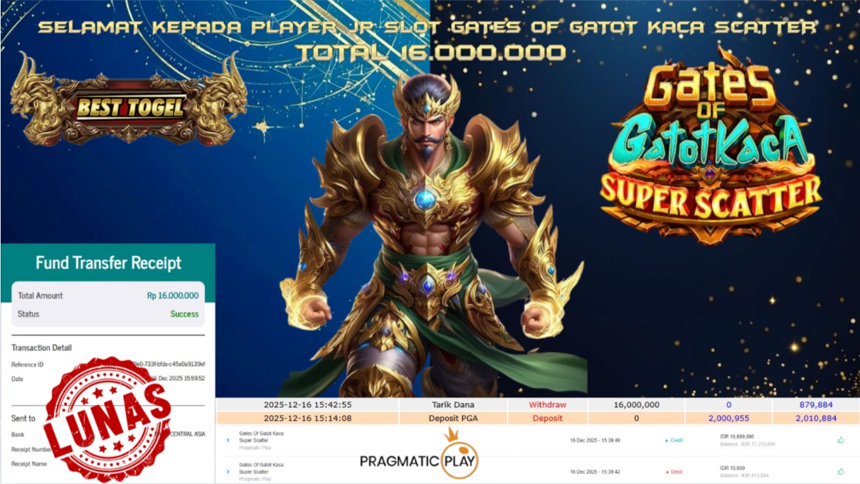 Selamat kepada User id : BQP****** Telah berhasil mendapatkan kemenangan besar pada permainan SLOT GATES OF GATOT KACA SUPER SCATTER dengan total kemenangan Sebesar Rp. 16.000.000 ,- Setelah mengisi formulir withdraw dengan kurung waktu hanya 5 – 10 menit pihak BESTTOGEL sudah melakukan transfer kepada pemilik Userid dan dana sudah dapat di cairkan oleh pemenang. Bukti pembayaran yang kami berikan merupakan bukti pembayaran yang SAH / VALID yang langung di dapatkan melaui tanda transfer transaksi dari Bank yang di tuju.