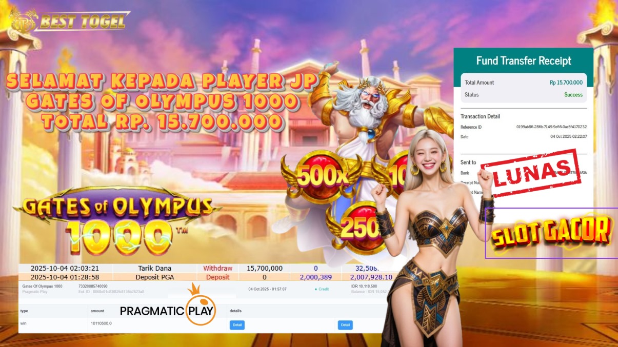kepada User id : SDS****** Telah berhasil mendapatkan kemenangan besar pada permainan SLOT GATES OF OLUMPYS 1000 dengan total kemenangan Sebesar Rp.15.700.000,- Setelah mengisi formulir withdraw dengan kurung waktu hanya 5 – 10 menit pihak BESTTOGEL sudah melakukan transfer kepada pemilik Userid dan dana sudah dapat di cairkan oleh pemenang. Bukti pembayaran yang kami berikan merupakan bukti pembayaran yang SAH / VALID yang langung di dapatkan melaui tanda transfer transaksi dari Bank yang di tuju.