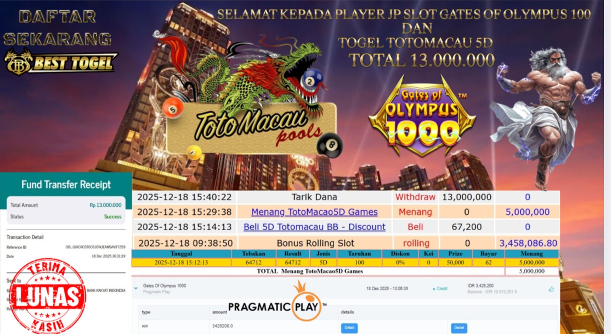 Selamat kepada User id : DOQ****** Telah berhasil mendapatkan kemenangan besar pada permainan SLOT GATES OF OLYMPUS 1000 DAN TOTOMACAU 5D dengan total kemenangan Sebesar Rp. 13.000.000 ,- Setelah mengisi formulir withdraw dengan kurung waktu hanya 5 – 10 menit pihak BESTTOGEL sudah melakukan transfer kepada pemilik Userid dan dana sudah dapat di cairkan oleh pemenang. Bukti pembayaran yang kami berikan merupakan bukti pembayaran yang SAH / VALID yang langung di dapatkan melaui tanda transfer transaksi dari Bank yang di tuju.