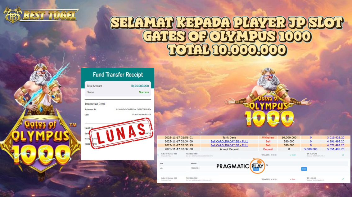Selamat kepada User id : RJQ****** Telah berhasil mendapatkan kemenangan besar pada permainan SLOT GATES OF OLYMPUS 1000 dengan total kemenangan Sebesar Rp 10.000.000 ,- Setelah mengisi formulir withdraw dengan kurung waktu hanya 5 – 10 menit pihak BESTTOGEL sudah melakukan transfer kepada pemilik Userid dan dana sudah dapat di cairkan oleh pemenang. Bukti pembayaran yang kami berikan merupakan bukti pembayaran yang SAH / VALID yang langung di dapatkan melaui tanda transfer transaksi dari Bank yang di tuju.