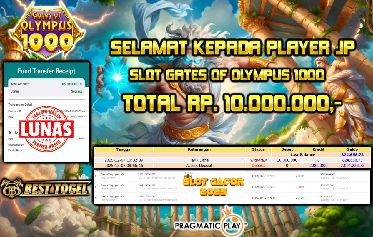 Selamat kepada User id : UMA****** Telah berhasil mendapatkan kemenangan besar pada permainan SLOT GATES OF OLYMPUS 1000 dengan total kemenangan Sebesar Rp. 10.000.000,- Setelah mengisi formulir withdraw dengan kurung waktu hanya 5 – 10 menit pihak BESTTOGEL sudah melakukan transfer kepada pemilik Userid dan dana sudah dapat di cairkan oleh pemenang. Bukti pembayaran yang kami berikan merupakan bukti pembayaran yang SAH / VALID yang langung di dapatkan melaui tanda transfer transaksi dari Bank yang di tuju.
