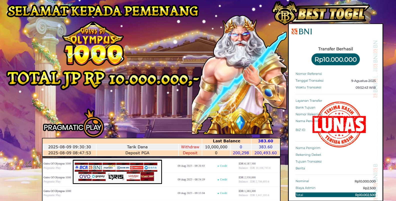 kepada User id : HOK***** Telah berhasil mendapatkan kemenangan besar pada permainan SLOT GATES OF OLYMPUS 1000 dengan total kemenangan Sebesar Rp. 10.000.000,00- Setelah mengisi formulir withdraw dengan kurung waktu hanya 5 – 10 menit pihak BESTTOGEL sudah melakukan transfer kepada pemilik Userid dan dana sudah dapat di cairkan oleh pemenang. Bukti pembayaran yang kami berikan merupakan bukti pembayaran yang SAH / VALID yang langung di dapatkan melaui tanda transfer transaksi dari Bank yang di tuju.