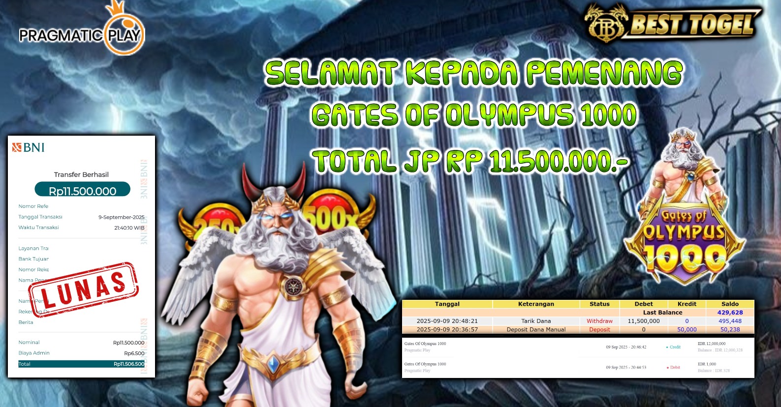 kepada User id : MSM***** Telah berhasil mendapatkan kemenangan besar pada permainan SLOT GATES OF OLYMPUS 1000 dengan total kemenangan Sebesar Rp. 11.500.000,00- Setelah mengisi formulir withdraw dengan kurung waktu hanya 5 – 10 menit pihak BESTTOGEL sudah melakukan transfer kepada pemilik Userid dan dana sudah dapat di cairkan oleh pemenang. Bukti pembayaran yang kami berikan merupakan bukti pembayaran yang SAH / VALID yang langung di dapatkan melaui tanda transfer transaksi dari Bank yang di tuju.