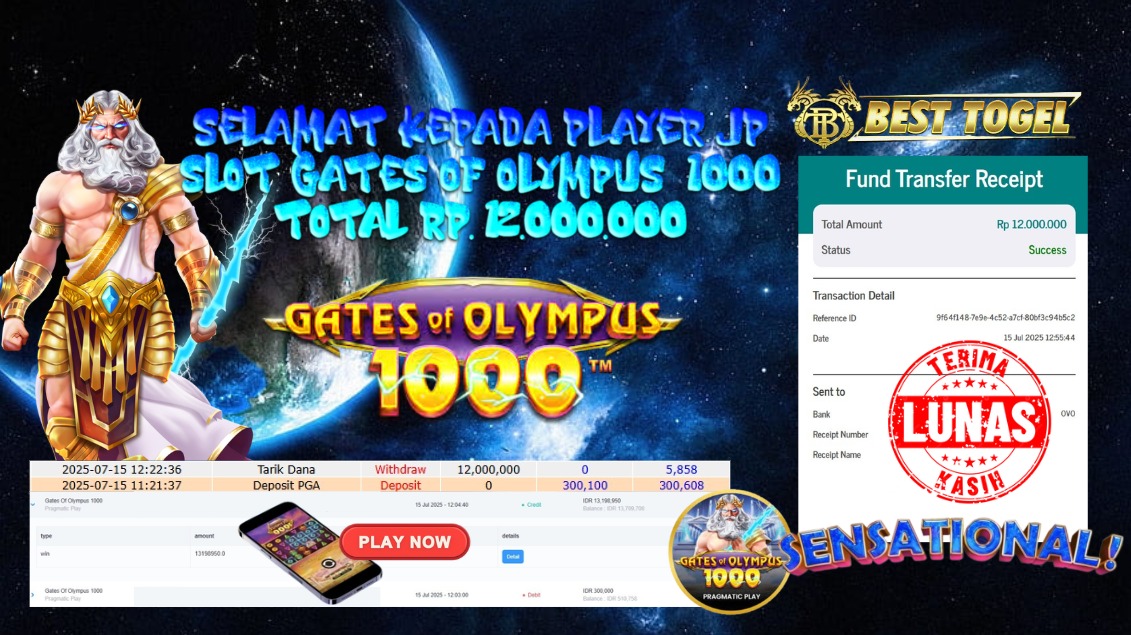 Selamat kepada User id : TOM***** Telah berhasil mendapatkan kemenangan besar pada permainan SLOT GATES OF OLYMPUS 1000 dengan total kemenangan Sebesar Rp 12.000.000,- Setelah mengisi formulir withdraw dengan kurung waktu hanya 5 – 10 menit pihak BESTTOGEL sudah melakukan transfer kepada pemilik Userid dan dana sudah dapat di cairkan oleh pemenang. Bukti pembayaran yang kami berikan merupakan bukti pembayaran yang SAH / VALID yang langung di dapatkan melaui tanda transfer transaksi dari Bank yang di tuju.