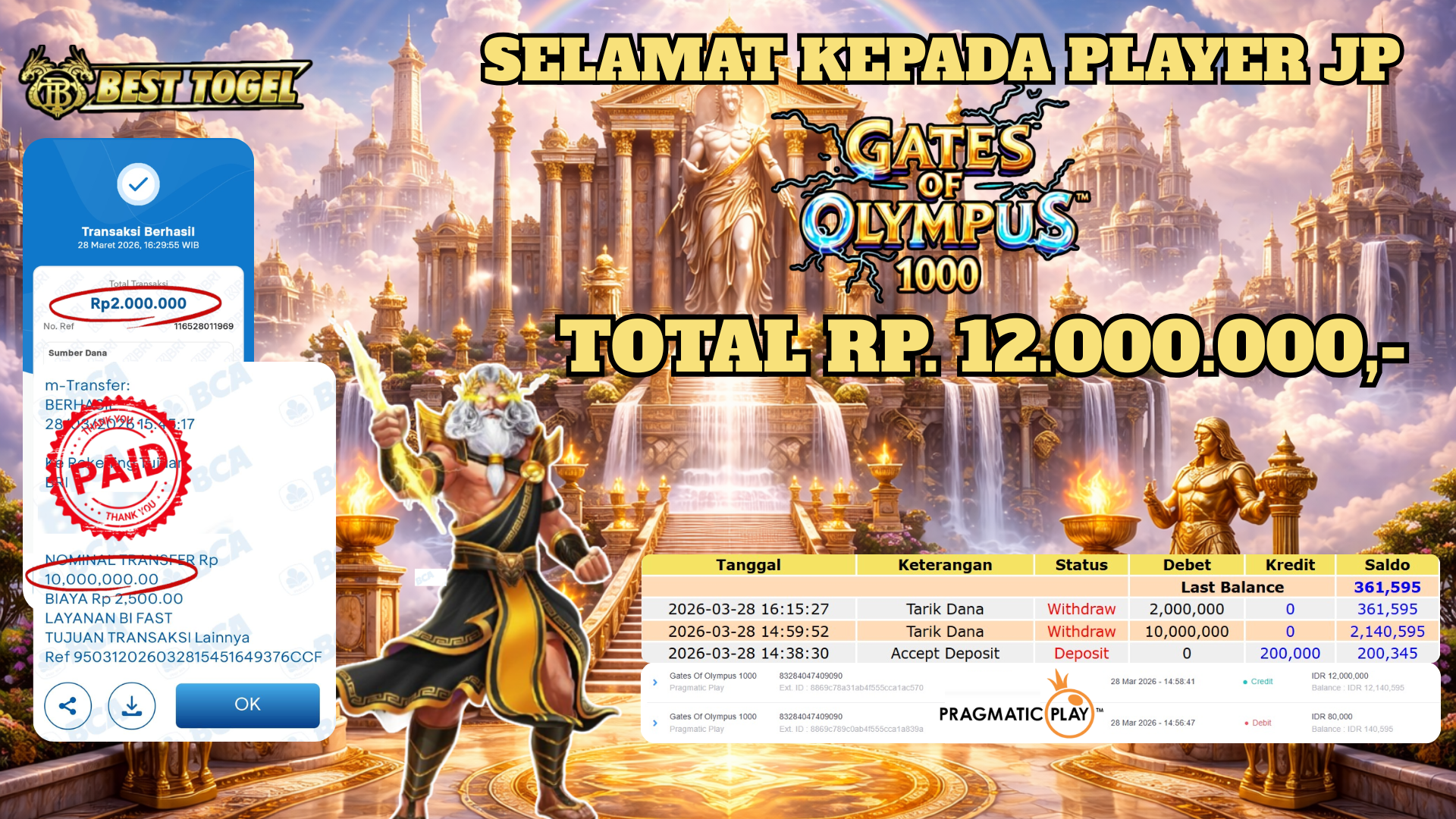 Selamat kepada User id :BNT****** Telah berhasil mendapatkan kemenangan besar pada permainan SLOT GATES OF OLYMPUS 1000 dengan total kemenangan Sebesar Rp.12.000.000,– Setelah mengisi formulir withdraw dengan kurung waktu hanya 5 – 10 menit pihak BESTTOGEL sudah melakukan transfer kepada pemilik Userid dan dana sudah dapat di cairkan oleh pemenang. Bukti pembayaran yang kami berikan merupakan bukti pembayaran yang SAH / VALID yang langung di dapatkan melaui tanda transfer transaksi dari Bank yang di tuju.