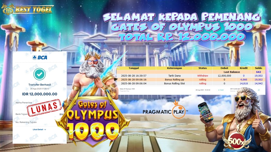 kepada User id : ALD***** Telah berhasil mendapatkan kemenangan besar pada permainan SLOT GATES OF OLYMPUS 1000 dengan total kemenangan Sebesar Rp. 12.000.000,00- Setelah mengisi formulir withdraw dengan kurung waktu hanya 5 – 10 menit pihak BESTTOGEL sudah melakukan transfer kepada pemilik Userid dan dana sudah dapat di cairkan oleh pemenang. Bukti pembayaran yang kami berikan merupakan bukti pembayaran yang SAH / VALID yang langung di dapatkan melaui tanda transfer transaksi dari Bank yang di tuju.