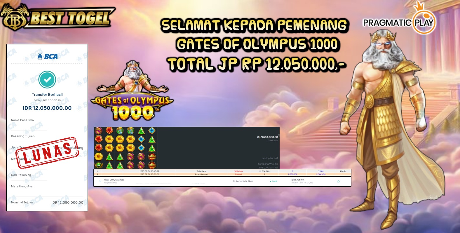 kepada User id : P21***** Telah berhasil mendapatkan kemenangan besar pada permainan SLOT GATES OF OLYMPUS 1000 dengan total kemenangan Sebesar Rp. 12.050.000,00- Setelah mengisi formulir withdraw dengan kurung waktu hanya 5 – 10 menit pihak BESTTOGEL sudah melakukan transfer kepada pemilik Userid dan dana sudah dapat di cairkan oleh pemenang. Bukti pembayaran yang kami berikan merupakan bukti pembayaran yang SAH / VALID yang langung di dapatkan melaui tanda transfer transaksi dari Bank yang di tuju.