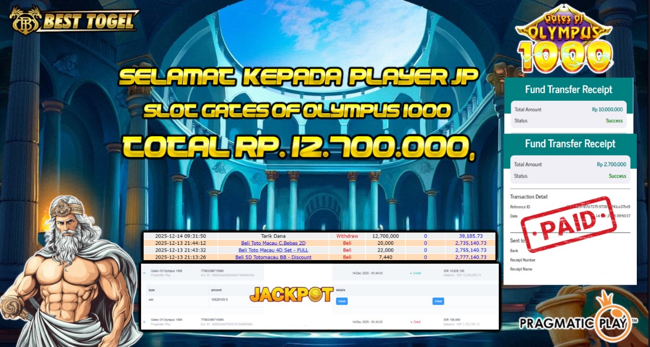 BUKTI JACKPOT SLOT GATES OF OLYMPUS 1000 RP.12.700.000- LUNAS