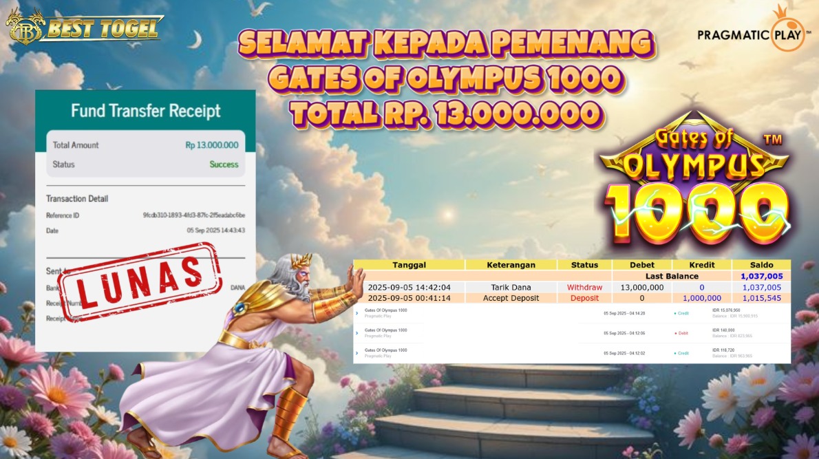 BUKTI JACKPOT SLOT GATES OF OLYMPUS 1000 Rp. 13.000.000,00- LUNAS