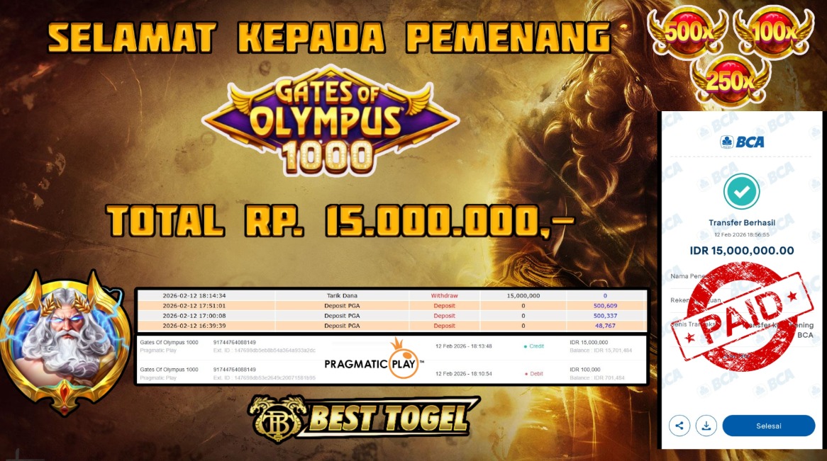 Selamat kepada User id : PRA****** Telah berhasil mendapatkan kemenangan besar pada permainan SLOT GATES  OF OLYMPUS 1000  dengan total kemenangan Sebesar Rp.15.000.000,– Setelah mengisi formulir withdraw dengan kurung waktu hanya 5 – 10 menit pihak  BESTTOGEL sudah melakukan transfer kepada pemilik Userid dan dana sudah dapat di cairkan oleh pemenang. Bukti pembayaran yang kami berikan merupakan bukti pembayaran yang SAH / VALID yang langung di dapatkan melaui tanda transfer transaksi dari Bank yang di tuju.