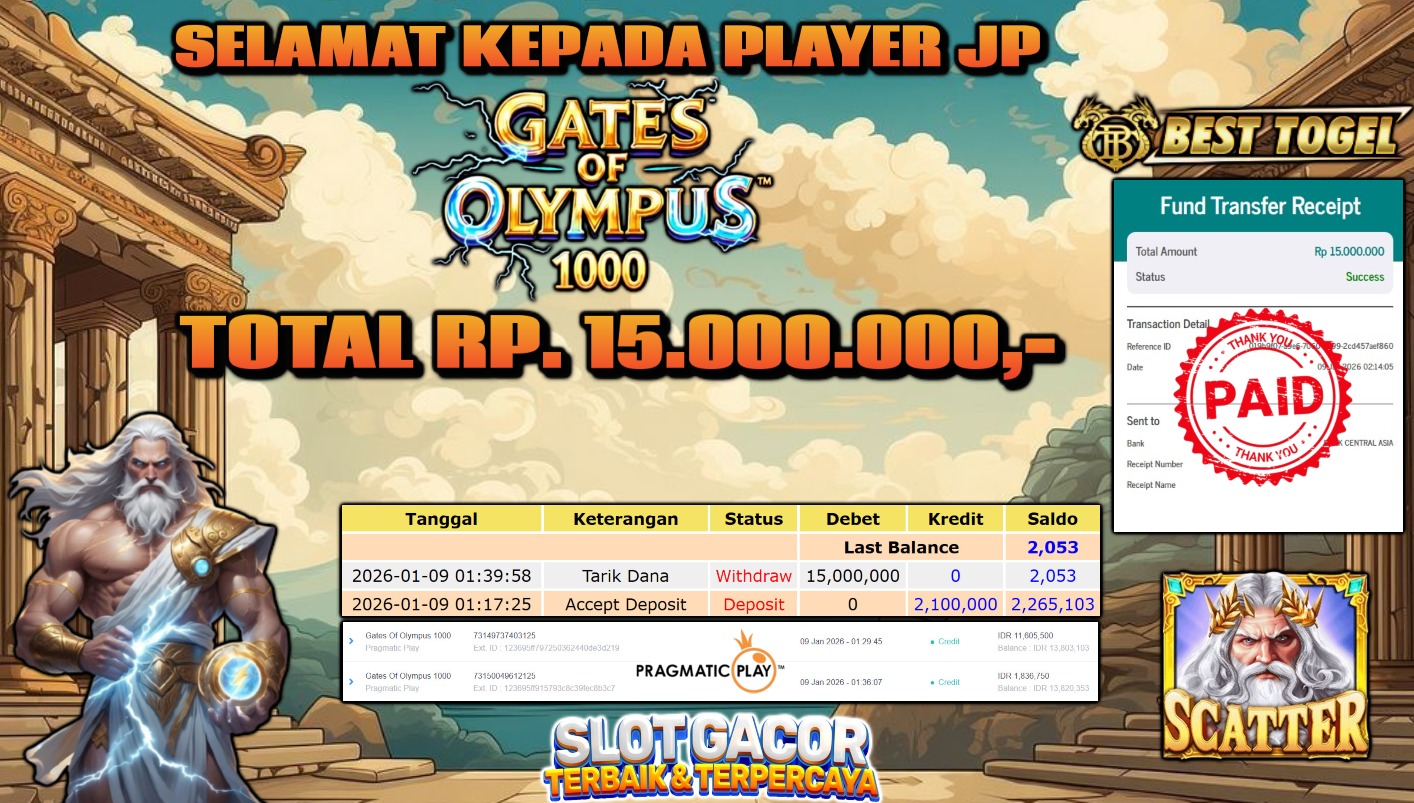 Selamat kepada User id : TRI****** Telah berhasil mendapatkan kemenangan besar pada permainan SLOT GATES OF OLYMPUS 1000 dengan total kemenangan Sebesar Rp.15.000.000,– Setelah mengisi formulir withdraw dengan kurung waktu hanya 5 – 10 menit pihak BESTTOGEL sudah melakukan transfer kepada pemilik Userid dan dana sudah dapat di cairkan oleh pemenang. Bukti pembayaran yang kami berikan merupakan bukti pembayaran yang SAH / VALID yang langung di dapatkan melaui tanda transfer transaksi dari Bank yang di tuju.