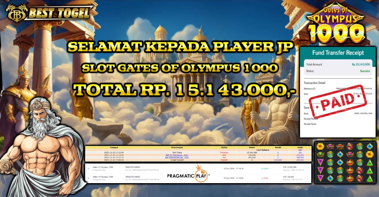 Selamat kepada User id : QOE****** Telah berhasil mendapatkan kemenangan besar pada permainan SLOT GATES OF OLYMPUS 1000 dengan total kemenangan Sebesar Rp. 15.143.000 ,- Setelah mengisi formulir withdraw dengan kurung waktu hanya 5 – 10 menit pihak BESTTOGEL sudah melakukan transfer kepada pemilik Userid dan dana sudah dapat di cairkan oleh pemenang. Bukti pembayaran yang kami berikan merupakan bukti pembayaran yang SAH / VALID yang langung di dapatkan melaui tanda transfer transaksi dari Bank yang di tuju.
