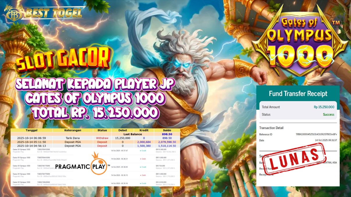 kepada User id : LM1****** Telah berhasil mendapatkan kemenangan besar pada permainan SLOT GATES OF OLYMPUS 1000 dengan total kemenangan Sebesar Rp. 15.250.000,- Setelah mengisi formulir withdraw dengan kurung waktu hanya 5 – 10 menit pihak BESTTOGEL sudah melakukan transfer kepada pemilik Userid dan dana sudah dapat di cairkan oleh pemenang. Bukti pembayaran yang kami berikan merupakan bukti pembayaran yang SAH / VALID yang langung di dapatkan melaui tanda transfer transaksi dari Bank yang di tuju.
