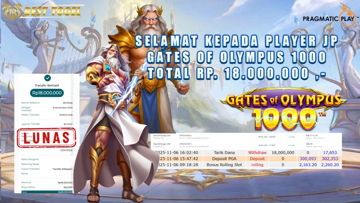 Selamat kepada User id : MN9****** Telah berhasil mendapatkan kemenangan besar pada permainan SLOT GATES OF OLYMPUS 1000 dengan total kemenangan Sebesar Rp 18.000.000 ,- Setelah mengisi formulir withdraw dengan kurung waktu hanya 5 – 10 menit pihak BESTTOGEL sudah melakukan transfer kepada pemilik Userid dan dana sudah dapat di cairkan oleh pemenang. Bukti pembayaran yang kami berikan merupakan bukti pembayaran yang SAH / VALID yang langung di dapatkan melaui tanda transfer transaksi dari Bank yang di tuju.
