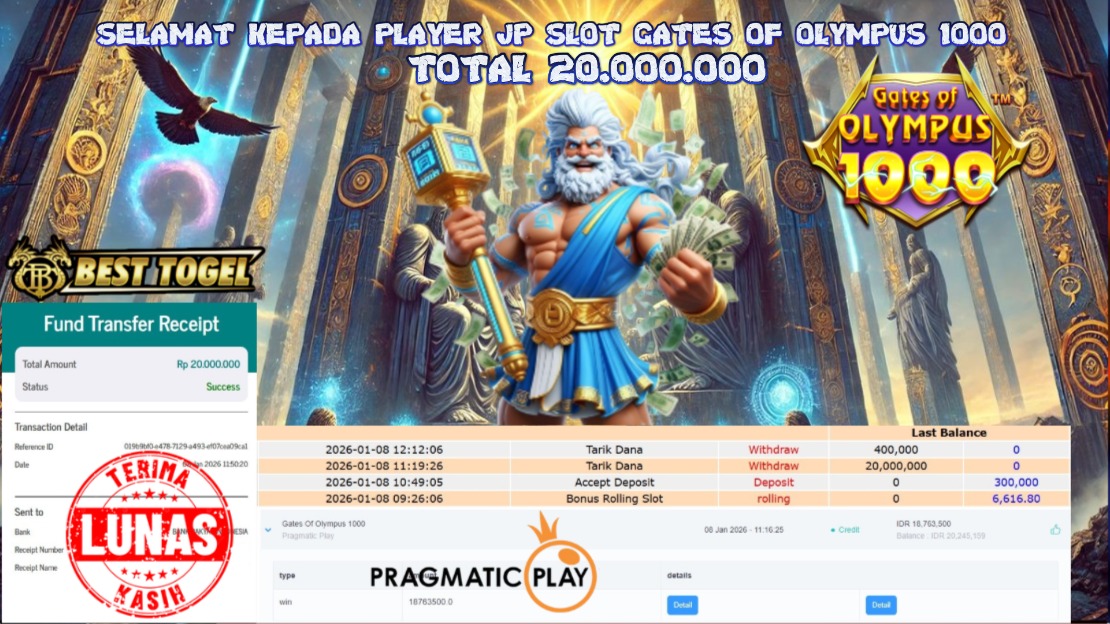 Selamat kepada User id : RCA****** Telah berhasil mendapatkan kemenangan besar pada permainan SLOT GATES OF OLYMPUS 1000 dengan total kemenangan Sebesar Rp.20.000.000,– Setelah mengisi formulir withdraw dengan kurung waktu hanya 5 – 10 menit pihak BESTTOGEL sudah melakukan transfer kepada pemilik Userid dan dana sudah dapat di cairkan oleh pemenang. Bukti pembayaran yang kami berikan merupakan bukti pembayaran yang SAH / VALID yang langung di dapatkan melaui tanda transfer transaksi dari Bank yang di tuju.