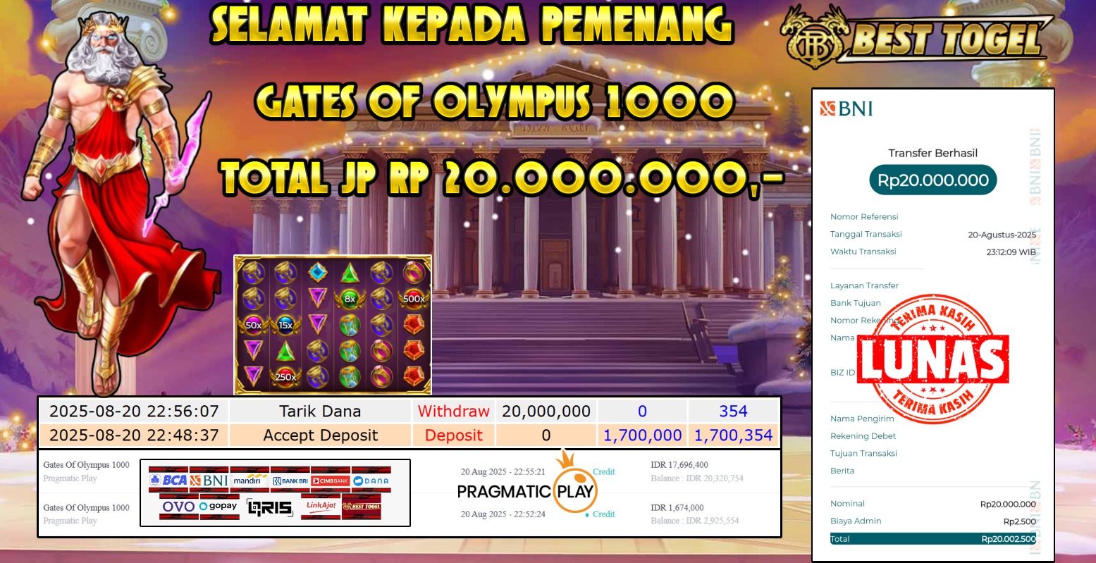 kepada User id : JNT***** Telah berhasil mendapatkan kemenangan besar pada permainan SLOT GATES OF OLYMPUS 1000 dengan total kemenangan Sebesar Rp. 20.000.000,00- Setelah mengisi formulir withdraw dengan kurung waktu hanya 5 – 10 menit pihak BESTTOGEL sudah melakukan transfer kepada pemilik Userid dan dana sudah dapat di cairkan oleh pemenang. Bukti pembayaran yang kami berikan merupakan bukti pembayaran yang SAH / VALID yang langung di dapatkan melaui tanda transfer transaksi dari Bank yang di tuju.