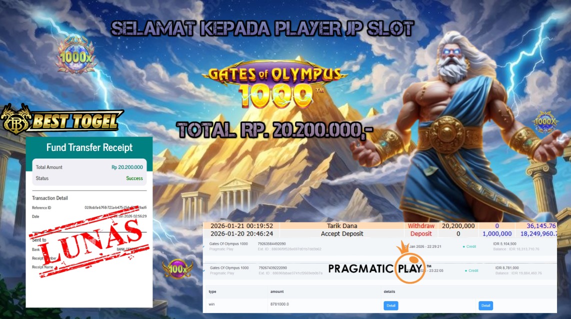 Selamat kepada User id : SRY****** Telah berhasil mendapatkan kemenangan besar pada permainan SLOT GATES OF OLYMPUS 1000 dengan total kemenangan Sebesar Rp.20.200.000,– Setelah mengisi formulir withdraw dengan kurung waktu hanya 5 – 10 menit pihak BESTTOGEL sudah melakukan transfer kepada pemilik Userid dan dana sudah dapat di cairkan oleh pemenang. Bukti pembayaran yang kami berikan merupakan bukti pembayaran yang SAH / VALID yang langung di dapatkan melaui tanda transfer transaksi dari Bank yang di tuju.