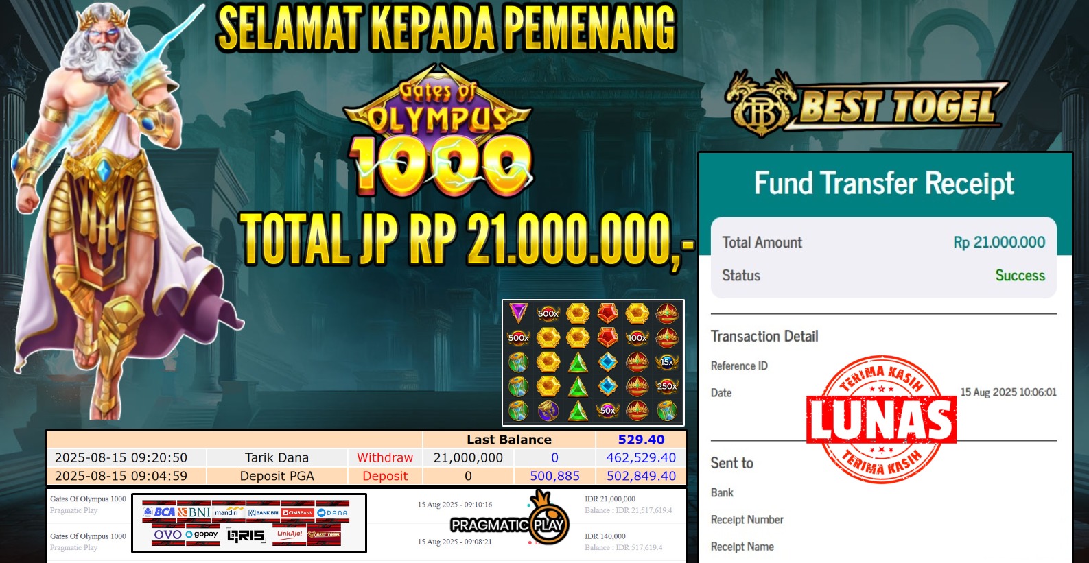 kepada User id : BDH***** Telah berhasil mendapatkan kemenangan besar pada permainan SLOT GATES OF OLYMPUS 1000 dengan total kemenangan Sebesar Rp. 21.000.000,00- Setelah mengisi formulir withdraw dengan kurung waktu hanya 5 – 10 menit pihak BESTTOGEL sudah melakukan transfer kepada pemilik Userid dan dana sudah dapat di cairkan oleh pemenang. Bukti pembayaran yang kami berikan merupakan bukti pembayaran yang SAH / VALID yang langung di dapatkan melaui tanda transfer transaksi dari Bank yang di tuju.