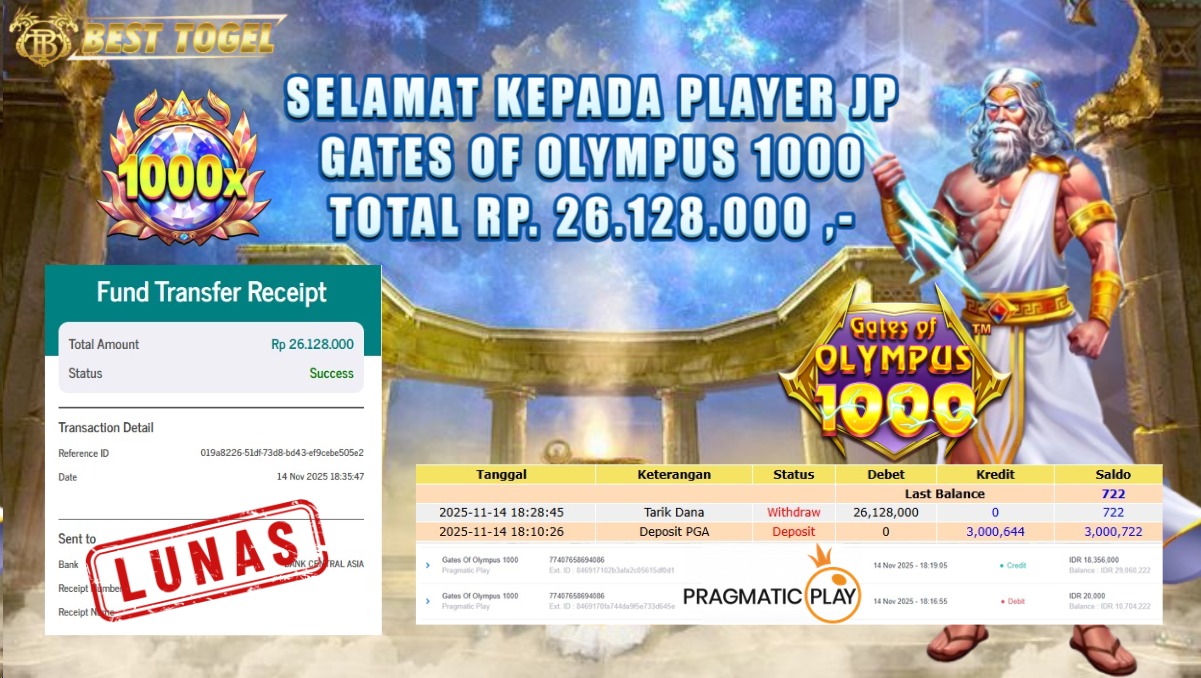 Selamat kepada User id : DGM****** Telah berhasil mendapatkan kemenangan besar pada permainan SLOT GATES OF OLYMPUS 1000 dengan total kemenangan Sebesar Rp 26.128.000 ,- Setelah mengisi formulir withdraw dengan kurung waktu hanya 5 – 10 menit pihak BESTTOGEL sudah melakukan transfer kepada pemilik Userid dan dana sudah dapat di cairkan oleh pemenang. Bukti pembayaran yang kami berikan merupakan bukti pembayaran yang SAH / VALID yang langung di dapatkan melaui tanda transfer transaksi dari Bank yang di tuju.