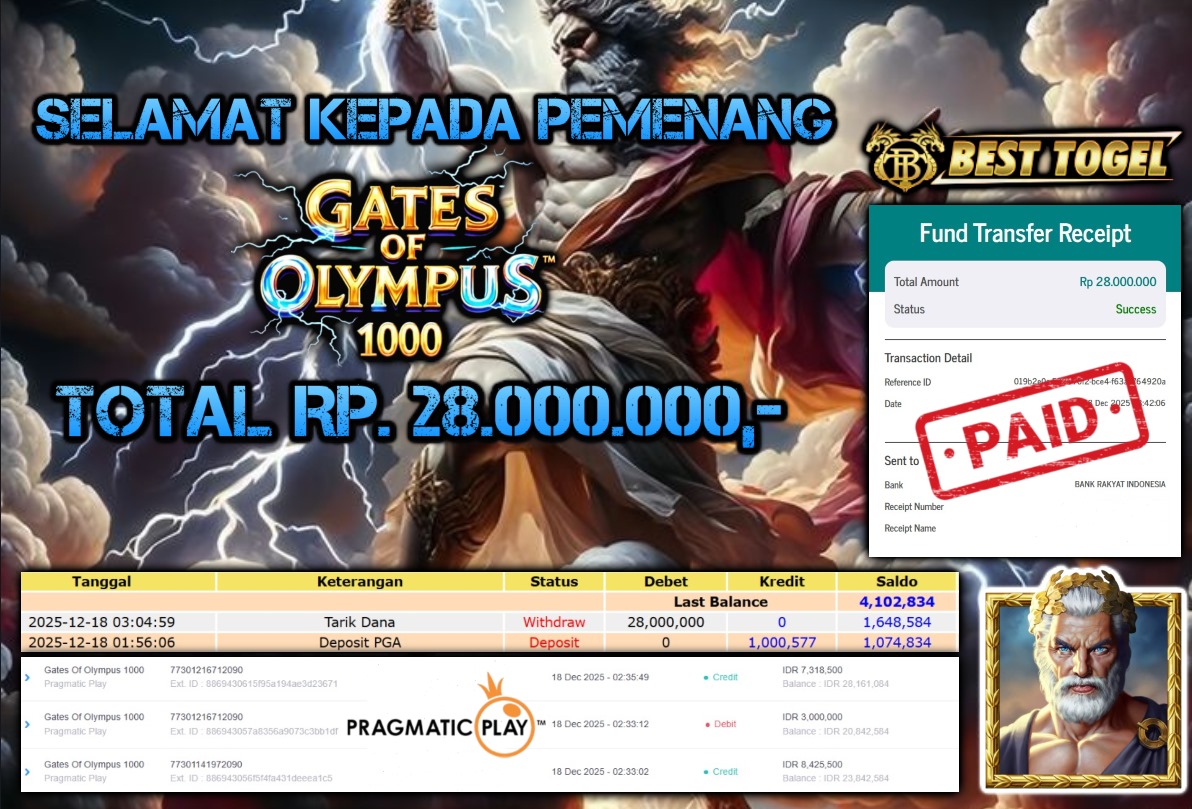 Selamat kepada User id : GFN****** Telah berhasil mendapatkan kemenangan besar pada permainan SLOT GATES OF OLYMPUS 1000 dengan total kemenangan Sebesar Rp. 28.000.000 ,- Setelah mengisi formulir withdraw dengan kurung waktu hanya 5 – 10 menit pihak BESTTOGEL sudah melakukan transfer kepada pemilik Userid dan dana sudah dapat di cairkan oleh pemenang. Bukti pembayaran yang kami berikan merupakan bukti pembayaran yang SAH / VALID yang langung di dapatkan melaui tanda transfer transaksi dari Bank yang di tuju.