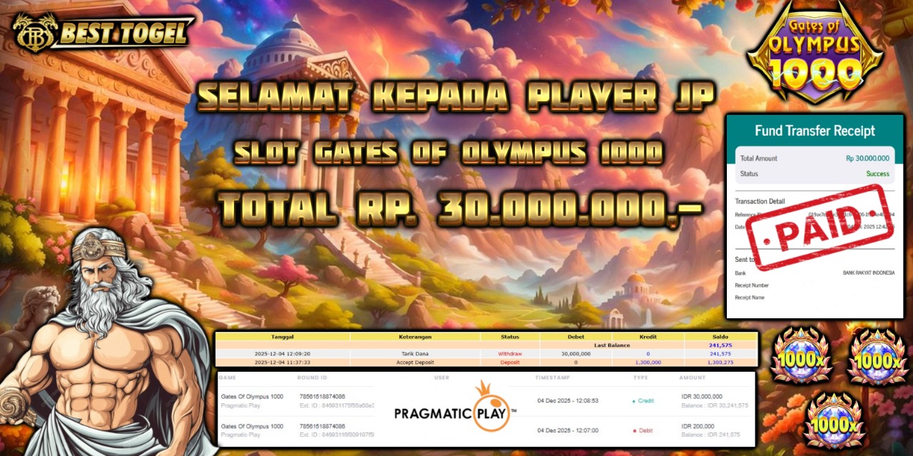 Selamat kepada User id : LQX****** Telah berhasil mendapatkan kemenangan besar pada permainan SLOT GATES OF OLYMPUS 1000 dengan total kemenangan Sebesar Rp. 30.000.000 ,- Setelah mengisi formulir withdraw dengan kurung waktu hanya 5 – 10 menit pihak BESTTOGEL sudah melakukan transfer kepada pemilik Userid dan dana sudah dapat di cairkan oleh pemenang. Bukti pembayaran yang kami berikan merupakan bukti pembayaran yang SAH / VALID yang langung di dapatkan melaui tanda transfer transaksi dari Bank yang di tuju.
