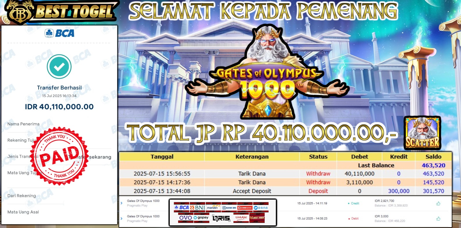 Selamat kepada User id : JAL***** Telah berhasil mendapatkan kemenangan besar pada permainan SLOT GATES OF OLYMPUS 1000 dengan total kemenangan Sebesar Rp. 40.110.000,00- Setelah mengisi formulir withdraw dengan kurung waktu hanya 5 – 10 menit pihak BESTTOGEL sudah melakukan transfer kepada pemilik Userid dan dana sudah dapat di cairkan oleh pemenang. Bukti pembayaran yang kami berikan merupakan bukti pembayaran yang SAH / VALID yang langung di dapatkan melaui tanda transfer transaksi dari Bank yang di tuju.