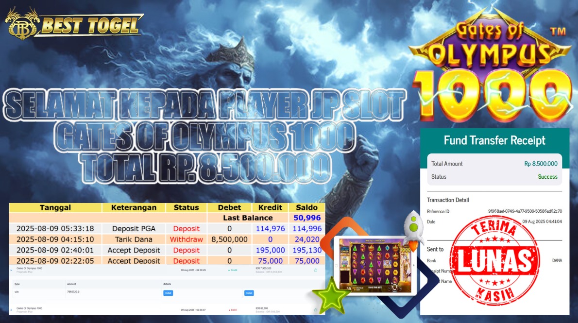 kepada User id : ALX***** Telah berhasil mendapatkan kemenangan besar pada permainan SLOT GATES OF OLYMPUS 1000 dengan total kemenangan Sebesar Rp.8.500.000,00- Setelah mengisi formulir withdraw dengan kurung waktu hanya 5 – 10 menit pihak BESTTOGEL sudah melakukan transfer kepada pemilik Userid dan dana sudah dapat di cairkan oleh pemenang. Bukti pembayaran yang kami berikan merupakan bukti pembayaran yang SAH / VALID yang langung di dapatkan melaui tanda transfer transaksi dari Bank yang di tuju.