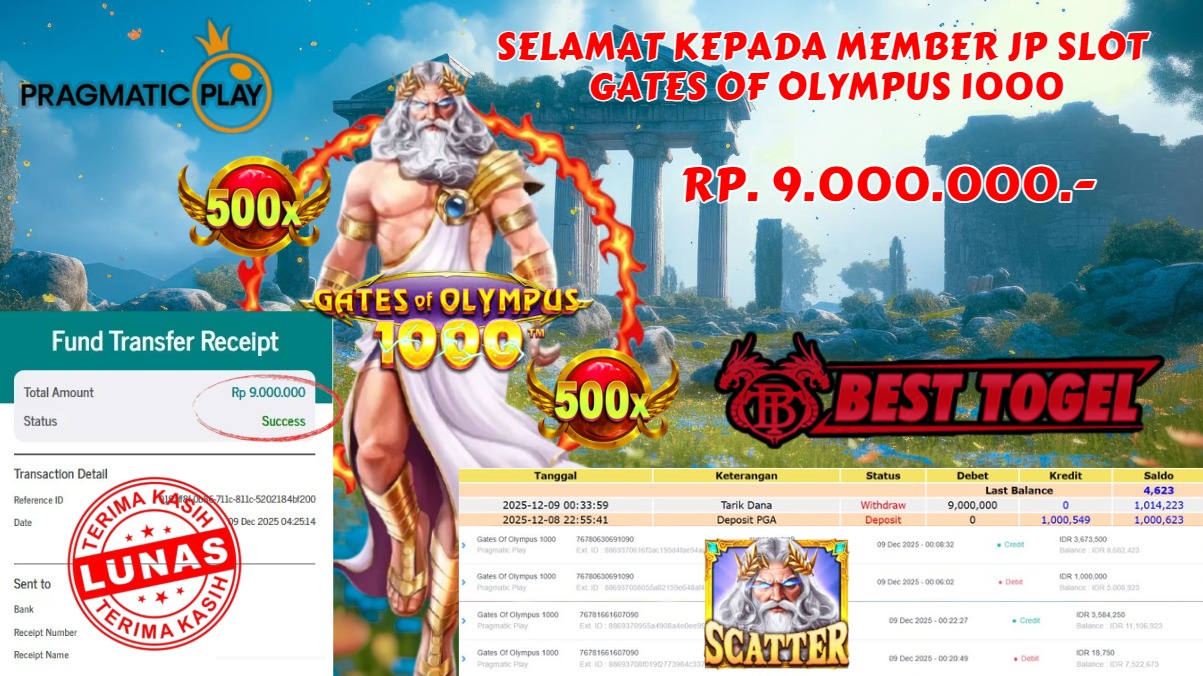 Selamat kepada User id : SUP****** Telah berhasil mendapatkan kemenangan besar pada permainan SLOT GATES OF OLYMPUS 1000 dengan total kemenangan Sebesar Rp. 9.000.000 ,- Setelah mengisi formulir withdraw dengan kurung waktu hanya 5 – 10 menit pihak BESTTOGEL sudah melakukan transfer kepada pemilik Userid dan dana sudah dapat di cairkan oleh pemenang. Bukti pembayaran yang kami berikan merupakan bukti pembayaran yang SAH / VALID yang langung di dapatkan melaui tanda transfer transaksi dari Bank yang di tuju.