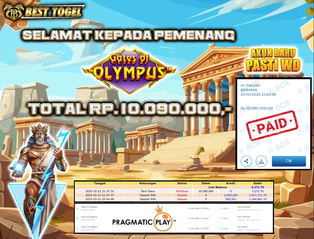 Selamat kepada User id : LIM****** Telah berhasil mendapatkan kemenangan besar pada permainan SLOT GATES OF OLYMPUS dengan total kemenangan Sebesar Rp 10.090.000,- Setelah mengisi formulir withdraw dengan kurung waktu hanya 5 – 10 menit pihak BESTTOGEL sudah melakukan transfer kepada pemilik Userid dan dana sudah dapat di cairkan oleh pemenang. Bukti pembayaran yang kami berikan merupakan bukti pembayaran yang SAH / VALID yang langung di dapatkan melaui tanda transfer transaksi dari Bank yang di tuju.