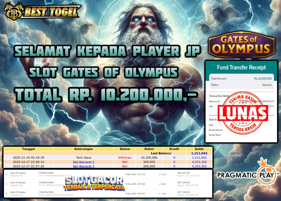Selamat kepada User id : REF****** Telah berhasil mendapatkan kemenangan besar pada permainan SLOT GATES OF OLYMPUS  dengan total kemenangan Sebesar Rp. 10.200.000 ,- Setelah mengisi formulir withdraw dengan kurung waktu hanya 5 – 10 menit pihak  BESTTOGEL sudah melakukan transfer kepada pemilik Userid dan dana sudah dapat di cairkan oleh pemenang. Bukti pembayaran yang kami berikan merupakan bukti pembayaran yang SAH / VALID yang langung di dapatkan melaui tanda transfer transaksi dari Bank yang di tuju.