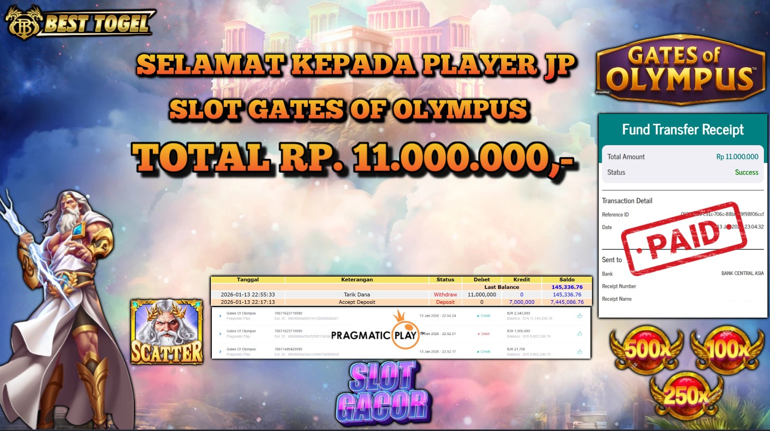 Selamat kepada User id : SUR****** Telah berhasil mendapatkan kemenangan besar pada permainan SLOT GATES OF OLYMPUS dengan total kemenangan Sebesar Rp.11.000.000,– Setelah mengisi formulir withdraw dengan kurung waktu hanya 5 – 10 menit pihak BESTTOGEL sudah melakukan transfer kepada pemilik Userid dan dana sudah dapat di cairkan oleh pemenang. Bukti pembayaran yang kami berikan merupakan bukti pembayaran yang SAH / VALID yang langung di dapatkan melaui tanda transfer transaksi dari Bank yang di tuju.