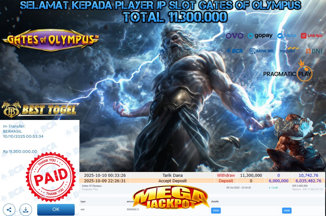 kepada User id : SRY****** Telah berhasil mendapatkan kemenangan besar pada permainan SLOT GATES OF OLYMPUS dengan total kemenangan Sebesar Rp. 11.300.000,- Setelah mengisi formulir withdraw dengan kurung waktu hanya 5 – 10 menit pihak BESTTOGEL sudah melakukan transfer kepada pemilik Userid dan dana sudah dapat di cairkan oleh pemenang. Bukti pembayaran yang kami berikan merupakan bukti pembayaran yang SAH / VALID yang langung di dapatkan melaui tanda transfer transaksi dari Bank yang di tuju.