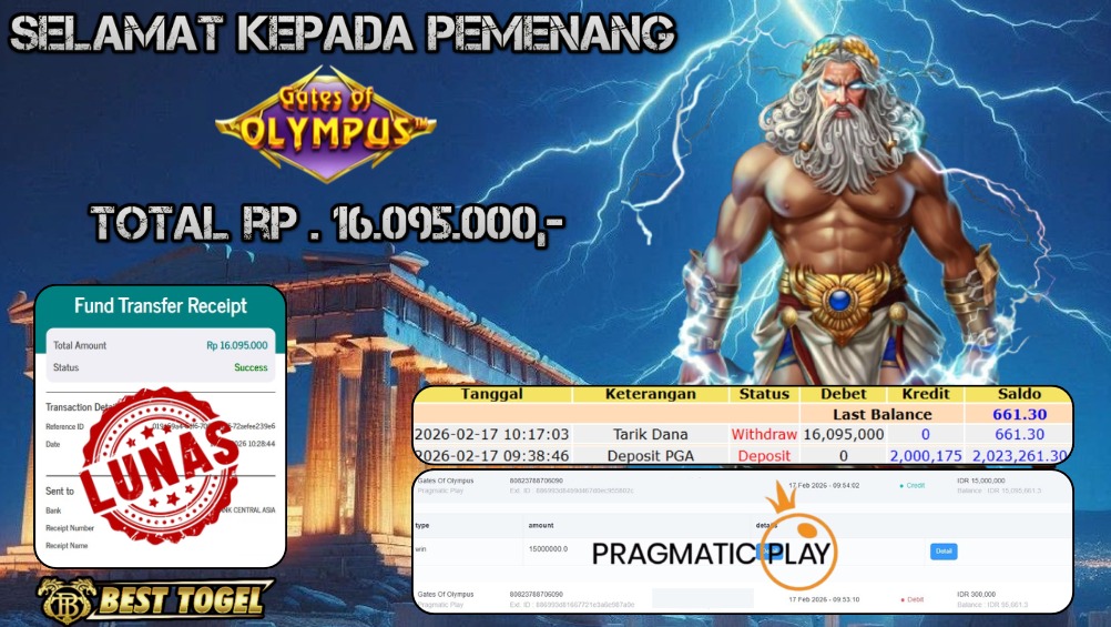 Selamat kepada User id : LIE****** Telah berhasil mendapatkan kemenangan besar pada permainan SLOT GATES OF OLYMPUS dengan total kemenangan Sebesar Rp.16.095.000,– Setelah mengisi formulir withdraw dengan kurung waktu hanya 5 – 10 menit pihak BESTTOGEL sudah melakukan transfer kepada pemilik Userid dan dana sudah dapat di cairkan oleh pemenang. Bukti pembayaran yang kami berikan merupakan bukti pembayaran yang SAH / VALID yang langung di dapatkan melaui tanda transfer transaksi dari Bank yang di tuju.