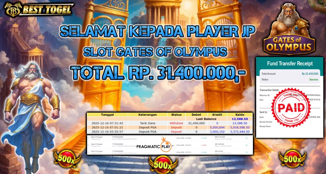 Selamat kepada User id : LM12****** Telah berhasil mendapatkan kemenangan besar pada permainan SLOT GATES OF OLYMPUS dengan total kemenangan Sebesar Rp. 31.400.000 ,- Setelah mengisi formulir withdraw dengan kurung waktu hanya 5 – 10 menit pihak BESTTOGEL sudah melakukan transfer kepada pemilik Userid dan dana sudah dapat di cairkan oleh pemenang. Bukti pembayaran yang kami berikan merupakan bukti pembayaran yang SAH / VALID yang langung di dapatkan melaui tanda transfer transaksi dari Bank yang di tuju.