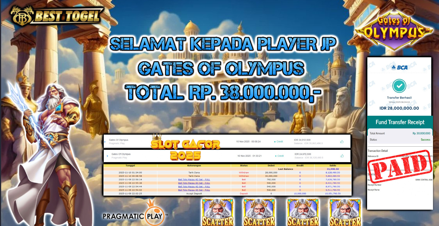 Selamat kepada User id : ANC****** Telah berhasil mendapatkan kemenangan besar pada permainan SLOT GATES OF OLYMPUS dengan total kemenangan Sebesar Rp 38.000.000 ,- Setelah mengisi formulir withdraw dengan kurung waktu hanya 5 – 10 menit pihak BESTTOGEL sudah melakukan transfer kepada pemilik Userid dan dana sudah dapat di cairkan oleh pemenang. Bukti pembayaran yang kami berikan merupakan bukti pembayaran yang SAH / VALID yang langung di dapatkan melaui tanda transfer transaksi dari Bank yang di tuju.