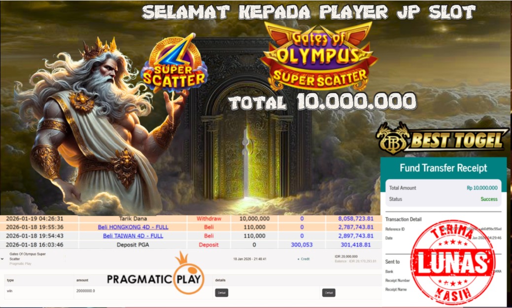 Selamat kepada User id : ENJ****** Telah berhasil mendapatkan kemenangan besar pada permainan SLOT GATES OF OLYMPUS SUPER SCATTER dengan total kemenangan Sebesar Rp.10.000.000,– Setelah mengisi formulir withdraw dengan kurung waktu hanya 5 – 10 menit pihak BESTTOGEL sudah melakukan transfer kepada pemilik Userid dan dana sudah dapat di cairkan oleh pemenang. Bukti pembayaran yang kami berikan merupakan bukti pembayaran yang SAH / VALID yang langung di dapatkan melaui tanda transfer transaksi dari Bank yang di tuju.