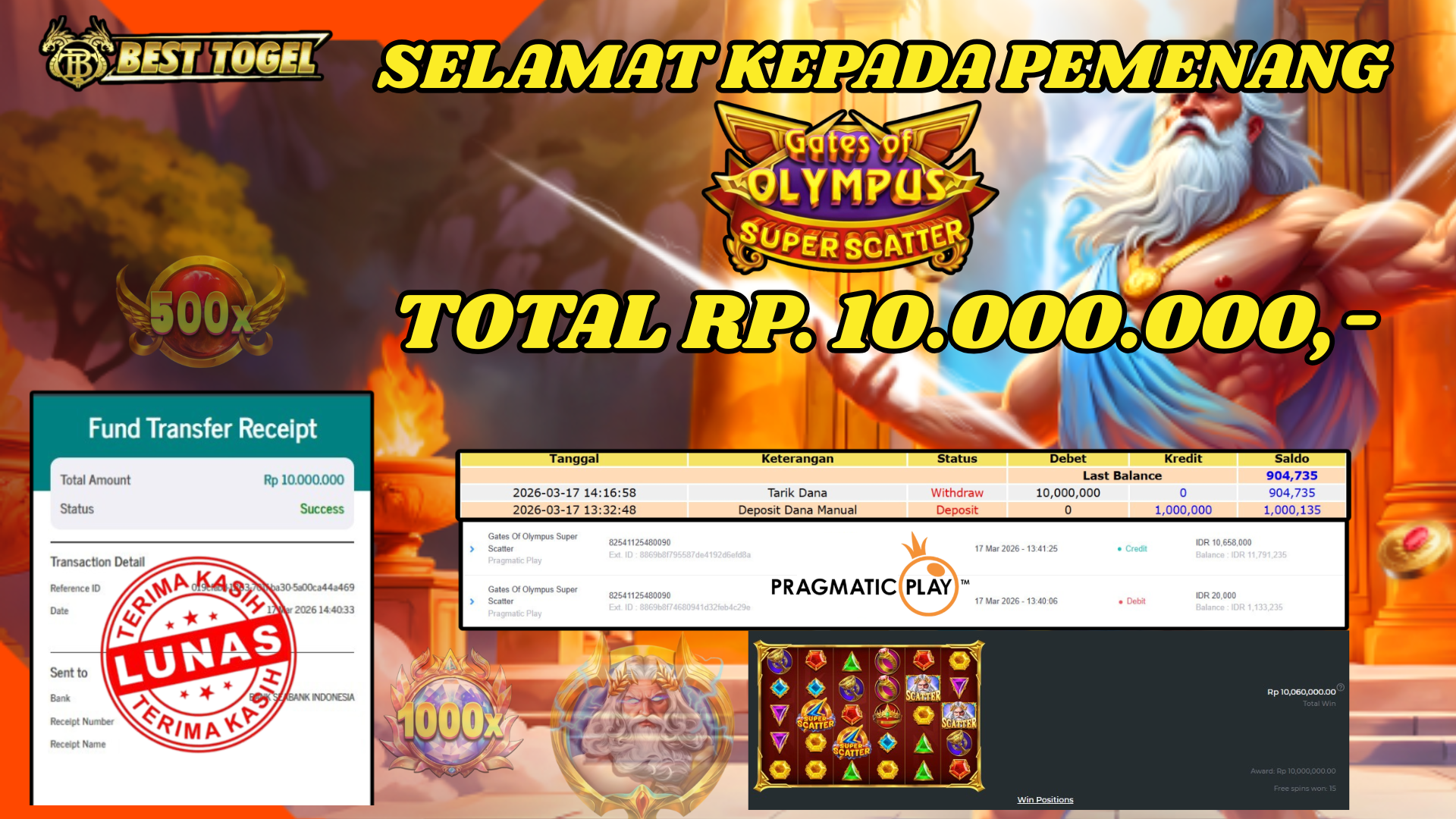 Selamat kepada User id : YTE****** Telah berhasil mendapatkan kemenangan besar pada permainan SLOT GATES OF OLYMPUS SUPER SCATTER dengan total kemenangan Sebesar Rp.10.000.000,– Setelah mengisi formulir withdraw dengan kurung waktu hanya 5 – 10 menit pihak  BESTTOGEL sudah melakukan transfer kepada pemilik Userid dan dana sudah dapat di cairkan oleh pemenang. Bukti pembayaran yang kami berikan merupakan bukti pembayaran yang SAH / VALID yang langung di dapatkan melaui tanda transfer transaksi dari Bank yang di tuju.