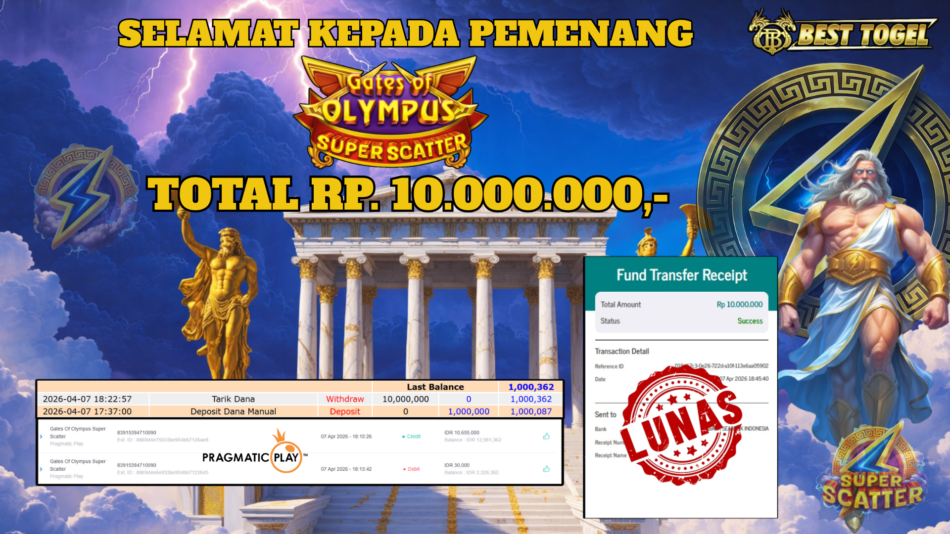 Selamat kepada User id : DE1****** Telah berhasil mendapatkan kemenangan besar pada permainanan SLOT GATES OF OLYMPUS SUPER SCATTER dengan total kemenangan Sebesar Rp. 10.000.000,– Setelah mengisi formulir withdraw dengan kurung waktu hanya 5 – 10 menit pihak BESTTOGEL sudah melakukan transfer kepada pemilik Userid dan dana sudah dapat di cairkan oleh pemenang. Bukti pembayaran yang kami berikan merupakan bukti pembayaran yang SAH / VALID yang langung di dapatkan melaui tanda transfer transaksi dari Bank yang di tuju.Kami mengucapakan banyak Terima Kasih Kepada pemenang karena sudah mempercayakan kami sebagai Bandar Tepercaya yang membayar semua kemenangan member