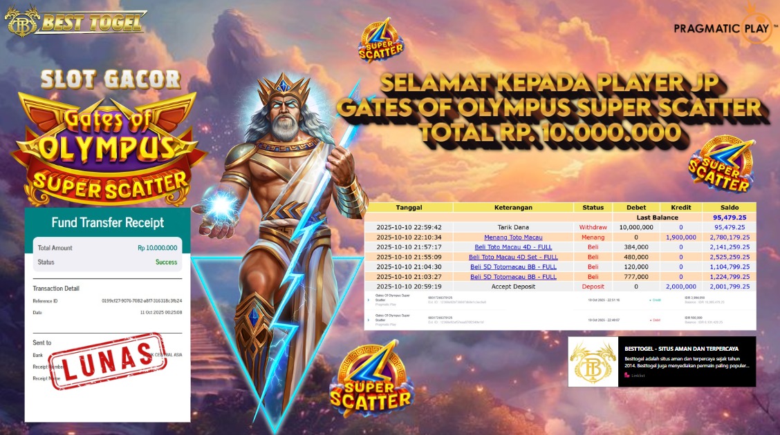 kepada User id : KMD****** Telah berhasil mendapatkan kemenangan besar pada permainan SLOT GATES OF OLYMPUS SUPER SCATTER dengan total kemenangan Sebesar Rp. 10.000.000,- Setelah mengisi formulir withdraw dengan kurung waktu hanya 5 – 10 menit pihak BESTTOGEL sudah melakukan transfer kepada pemilik Userid dan dana sudah dapat di cairkan oleh pemenang. Bukti pembayaran yang kami berikan merupakan bukti pembayaran yang SAH / VALID yang langung di dapatkan melaui tanda transfer transaksi dari Bank yang di tuju.