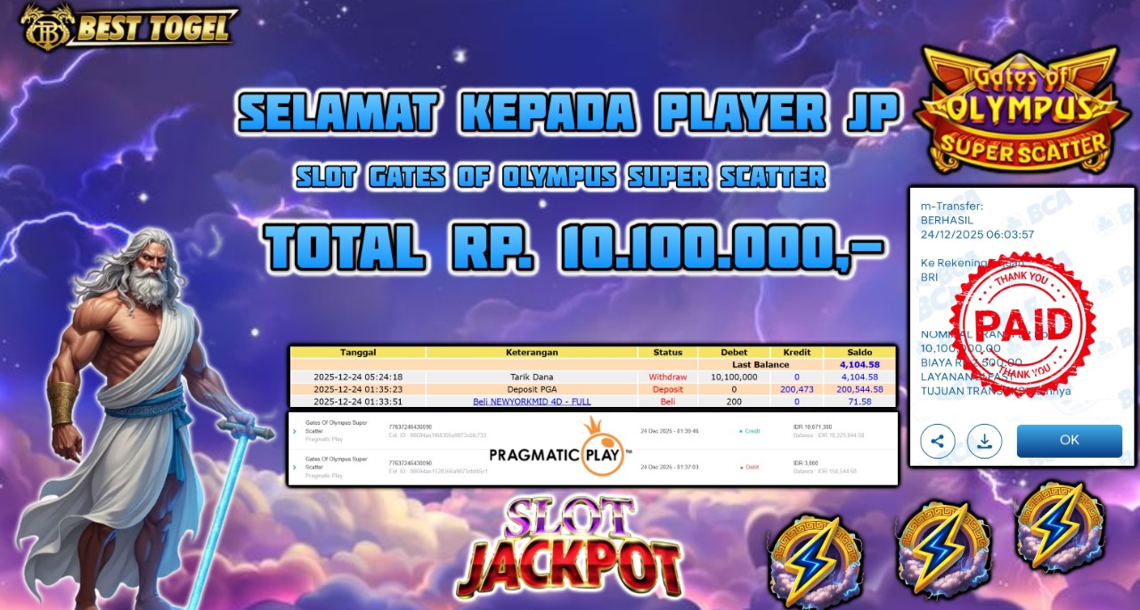 Selamat kepada User id : ZOU****** Telah berhasil mendapatkan kemenangan besar pada permainan SLOT GATES OF OLYMPUS SUPER SCATTER dengan total kemenangan Sebesar Rp. 10.100.000,- Setelah mengisi formulir withdraw dengan kurung waktu hanya 5 – 10 menit pihak BESTTOGEL sudah melakukan transfer kepada pemilik Userid dan dana sudah dapat di cairkan oleh pemenang. Bukti pembayaran yang kami berikan merupakan bukti pembayaran yang SAH / VALID yang langung di dapatkan melaui tanda transfer transaksi dari Bank yang di tuju.