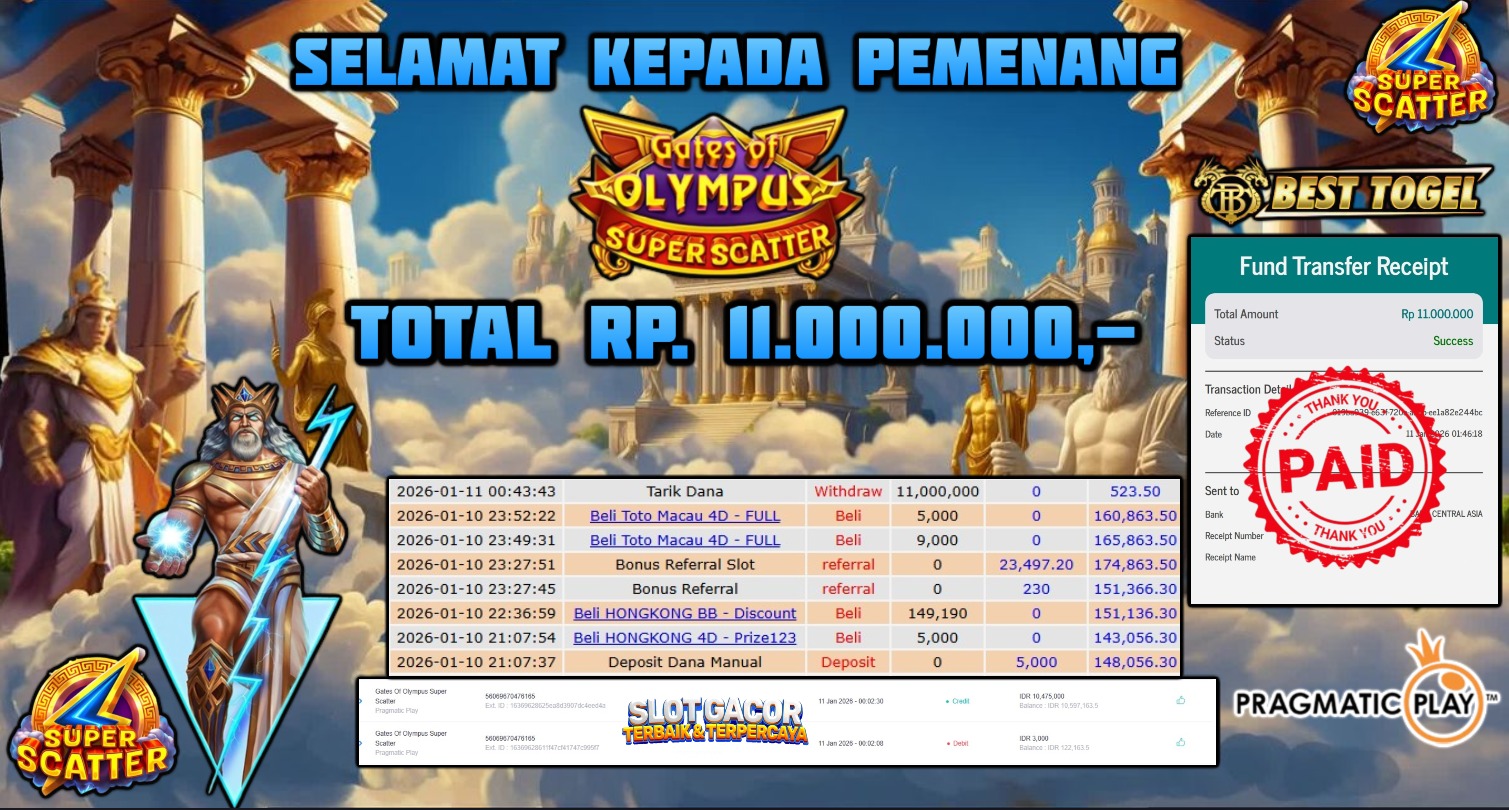 Selamat kepada User id : JHO****** Telah berhasil mendapatkan kemenangan besar pada permainan SLOT GATES OF OLYMPUS SUPER SCATTER dengan total kemenangan Sebesar Rp.11.000.000,– Setelah mengisi formulir withdraw dengan kurung waktu hanya 5 – 10 menit pihak BESTTOGEL sudah melakukan transfer kepada pemilik Userid dan dana sudah dapat di cairkan oleh pemenang. Bukti pembayaran yang kami berikan merupakan bukti pembayaran yang SAH / VALID yang langung di dapatkan melaui tanda transfer transaksi dari Bank yang di tuju.