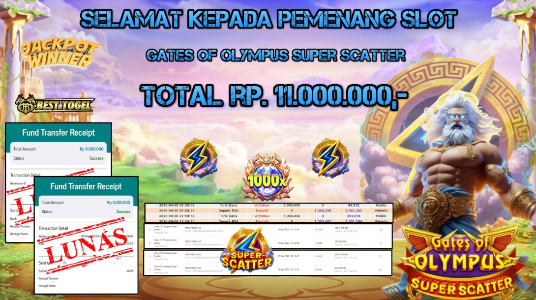 Selamat kepada User id : TBU*** Telah berhasil mendapatkan kemenangan besar pada permainanan SLOT GATES OF OLYMPUS SUPER SCATTER dengan total kemenangan Sebesar Rp. 11.000.000,– Setelah mengisi formulir withdraw dengan kurung waktu hanya 5 – 10 menit pihak BESTTOGEL sudah melakukan transfer kepada pemilik Userid dan dana sudah dapat di cairkan oleh pemenang. Bukti pembayaran yang kami berikan merupakan bukti pembayaran yang SAH / VALID yang langung di dapatkan melaui tanda transfer transaksi dari Bank yang di tuju.Kami mengucapakan banyak Terima Kasih Kepada pemenang karena sudah mempercayakan kami sebagai Bandar Tepercaya yang membayar semua kemenangan member