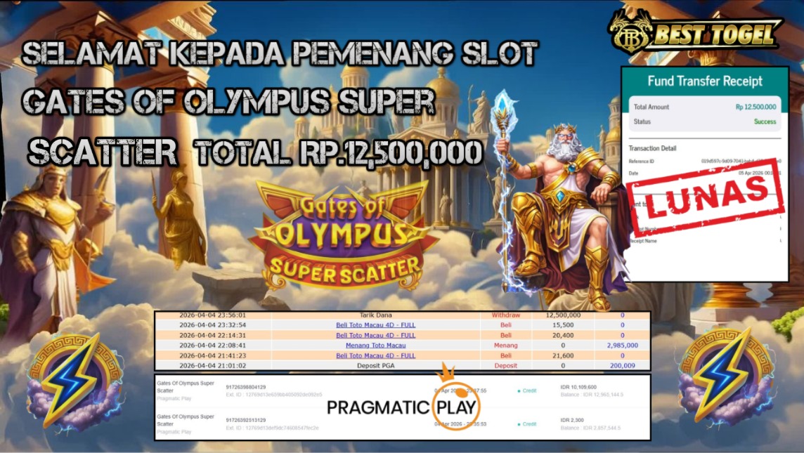 Selamat kepada User id : GAY****** Telah berhasil mendapatkan kemenangan besar pada permainanan SLOT GATES OF OLYMPUS SUPER SCATTER dengan total kemenangan Sebesar Rp. 12.500.000,– Setelah mengisi formulir withdraw dengan kurung waktu hanya 5 – 10 menit pihak BESTTOGEL sudah melakukan transfer kepada pemilik Userid dan dana sudah dapat di cairkan oleh pemenang. Bukti pembayaran yang kami berikan merupakan bukti pembayaran yang SAH / VALID yang langung di dapatkan melaui tanda transfer transaksi dari Bank yang di tuju.Kami mengucapakan banyak Terima Kasih Kepada pemenang karena sudah mempercayakan kami sebagai Bandar Tepercaya yang membayar semua kemenangan member