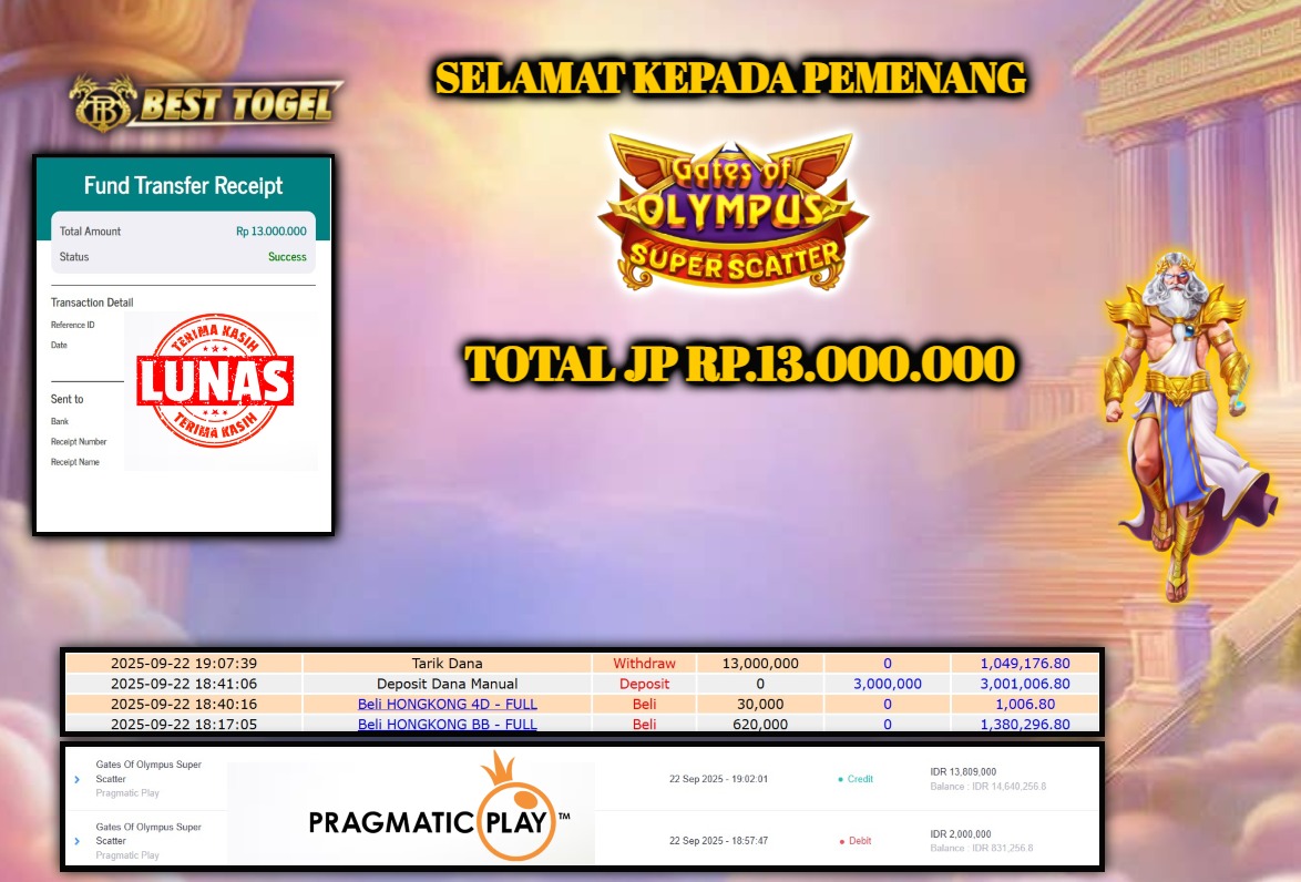 kepada User id : KAM****** Telah berhasil mendapatkan kemenangan besar pada permainan SLOT GATES OF OLYMPUS SUPER SCATTER dengan total kemenangan Sebesar Rp. 13.000.000,- Setelah mengisi formulir withdraw dengan kurung waktu hanya 5 – 10 menit pihak BESTTOGEL sudah melakukan transfer kepada pemilik Userid dan dana sudah dapat di cairkan oleh pemenang. Bukti pembayaran yang kami berikan merupakan bukti pembayaran yang SAH / VALID yang langung di dapatkan melaui tanda transfer transaksi dari Bank yang di tuju.
