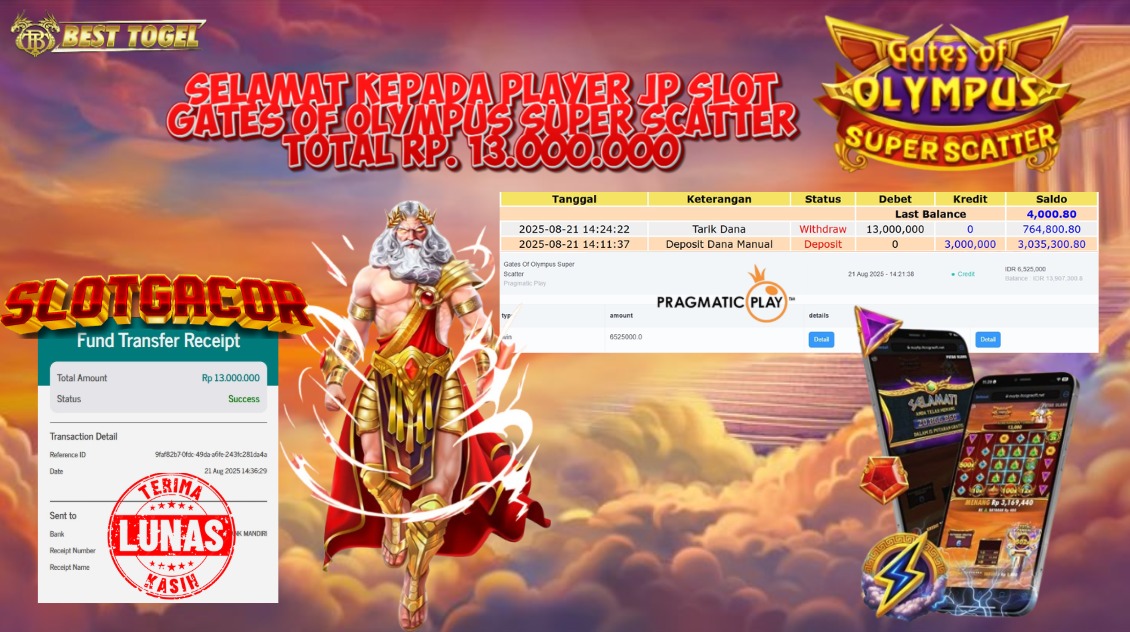 kepada User id : KBJ***** Telah berhasil mendapatkan kemenangan besar pada permainan SLOT GATES OF OLYMPUS SUPER SCATTER dengan total kemenangan Sebesar Rp. 13.000.000,00- Setelah mengisi formulir withdraw dengan kurung waktu hanya 5 – 10 menit pihak BESTTOGEL sudah melakukan transfer kepada pemilik Userid dan dana sudah dapat di cairkan oleh pemenang. Bukti pembayaran yang kami berikan merupakan bukti pembayaran yang SAH / VALID yang langung di dapatkan melaui tanda transfer transaksi dari Bank yang di tuju.