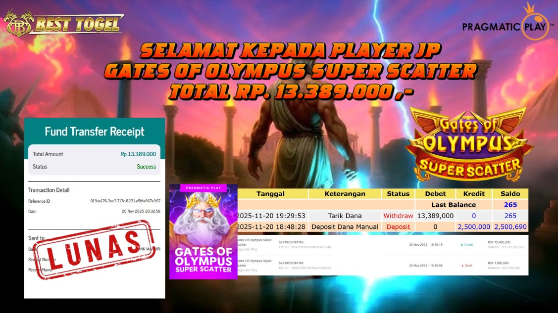 Selamat kepada User id : EXP****** Telah berhasil mendapatkan kemenangan besar pada permainan SLOT GATES OF OLYMPUS SUPER SCATTER dengan total kemenangan Sebesar Rp 13.389.000 ,- Setelah mengisi formulir withdraw dengan kurung waktu hanya 5 – 10 menit pihak BESTTOGEL sudah melakukan transfer kepada pemilik Userid dan dana sudah dapat di cairkan oleh pemenang. Bukti pembayaran yang kami berikan merupakan bukti pembayaran yang SAH / VALID yang langung di dapatkan melaui tanda transfer transaksi dari Bank yang di tuju.