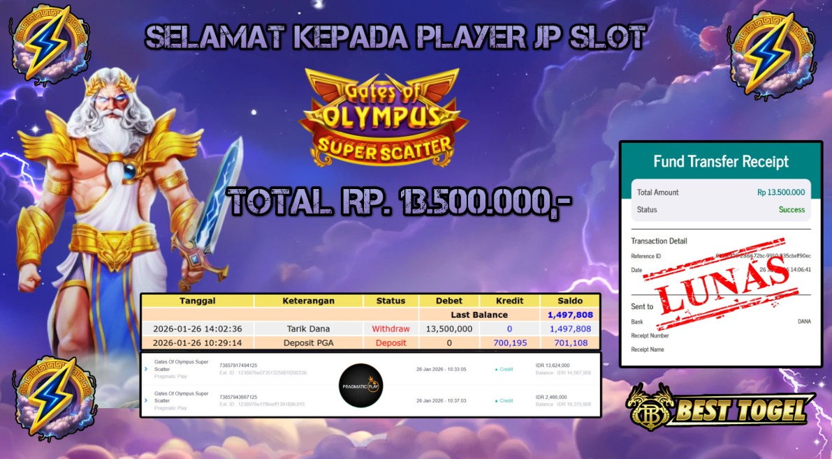 Selamat kepada User id : SPQ****** Telah berhasil mendapatkan kemenangan besar pada permainan SLOT GATES OF OLYMPUS SUPER SCATTER dengan total kemenangan Sebesar Rp.13.500.000,– Setelah mengisi formulir withdraw dengan kurung waktu hanya 5 – 10 menit pihak BESTTOGEL sudah melakukan transfer kepada pemilik Userid dan dana sudah dapat di cairkan oleh pemenang. Bukti pembayaran yang kami berikan merupakan bukti pembayaran yang SAH / VALID yang langung di dapatkan melaui tanda transfer transaksi dari Bank yang di tuju.