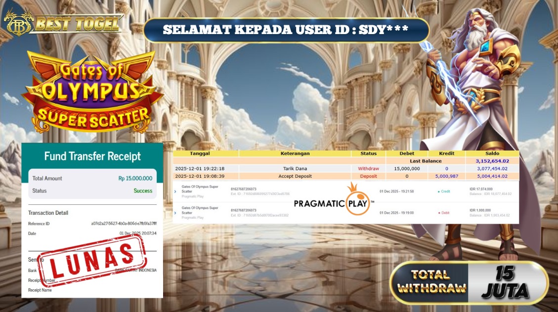 Selamat kepada User id : SDY****** Telah berhasil mendapatkan kemenangan besar pada permainan SLOT GATES OF OLYMPUS SUPER SCATTER dengan total kemenangan Sebesar Rp 15.000.000,- Setelah mengisi formulir withdraw dengan kurung waktu hanya 5 – 10 menit pihak  BESTTOGEL sudah melakukan transfer kepada pemilik Userid dan dana sudah dapat di cairkan oleh pemenang. Bukti pembayaran yang kami berikan merupakan bukti pembayaran yang SAH / VALID yang langung di dapatkan melaui tanda transfer transaksi dari Bank yang di tuju.